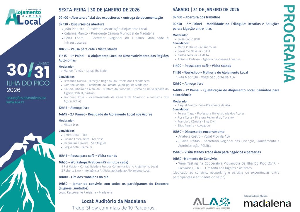 O 4.º Encontro do Alojamento Local dos Açores decorreu na Madalena, Ilha do Pico, reunindo proprietários de alojamento local de várias ilhas, entidades públicas, parceiros institucionais e decisores políticos, num momento de reflexão estratégica sobre o presente e o futuro do setor na Região Autónoma dos Açores. A sessão de abertura contou com intervenções do Presidente da Associação do Alojamento Local dos Açores (ALA), João Pinheiro, da Presidente da Câmara Municipal da Madalena, Catarina Manito, e de uma mensagem da Secretária Regional do Turismo, Mobilidade e Infraestruturas, Berta Cabral.